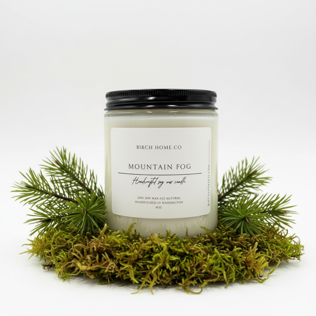 Mountain Fog - A candle inspired by the stillness of the forest floor. Notes of cool fern, dew-soaked moss, and soft fog drift together to capture the quiet beauty of the Pacific Northwest. Earthy yet refined, this scent brings the grounding calm of misty evergreens into your home.